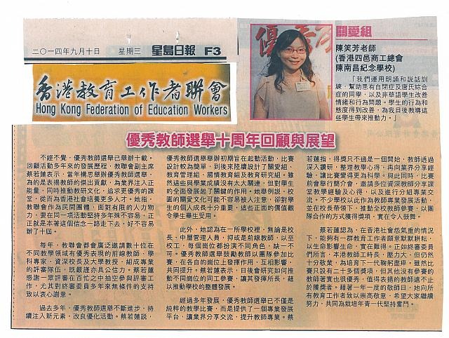 20140910_陳笑芳老師獲選為關愛組優秀教師 星島日報報導